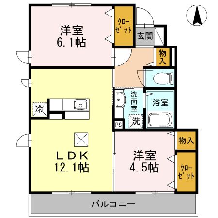 | 築年月 | 2014年9月 | 間取り | 2LDK( LDK12.1畳/洋室6.1畳/洋室4.5畳 ) | 専有面積 | 52.58m2 |