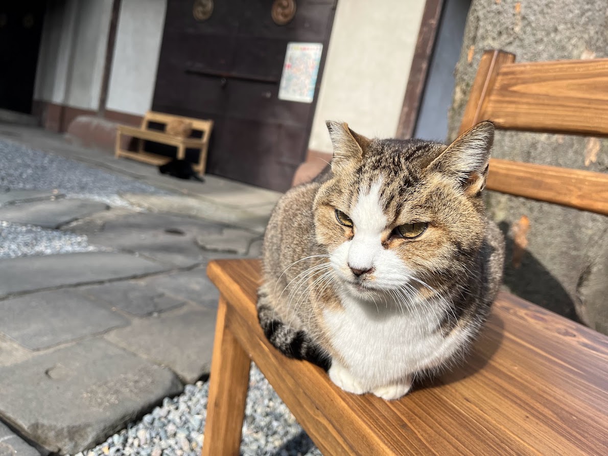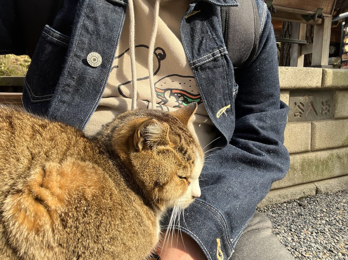 ベンチに座り絵馬に願掛けしてると猫がよって来ました。